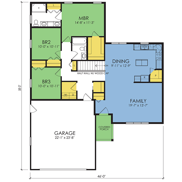 A part of our Wausau Originals, the Ellison floor plan features 3 bedrooms and 2 bathrooms with a foot print of 46x58 feet and 1458 total square feet of living space. Floor Plan #WO214