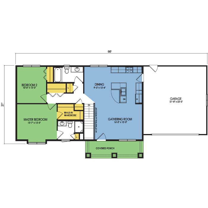 A part of our Dream Series, the Hickory floor plan features 2 bedrooms, 2 bathrooms, a 2 car garage, a footprint of 66x26 feet, and 1151 total square feet of living space. Floor Plan #DR123