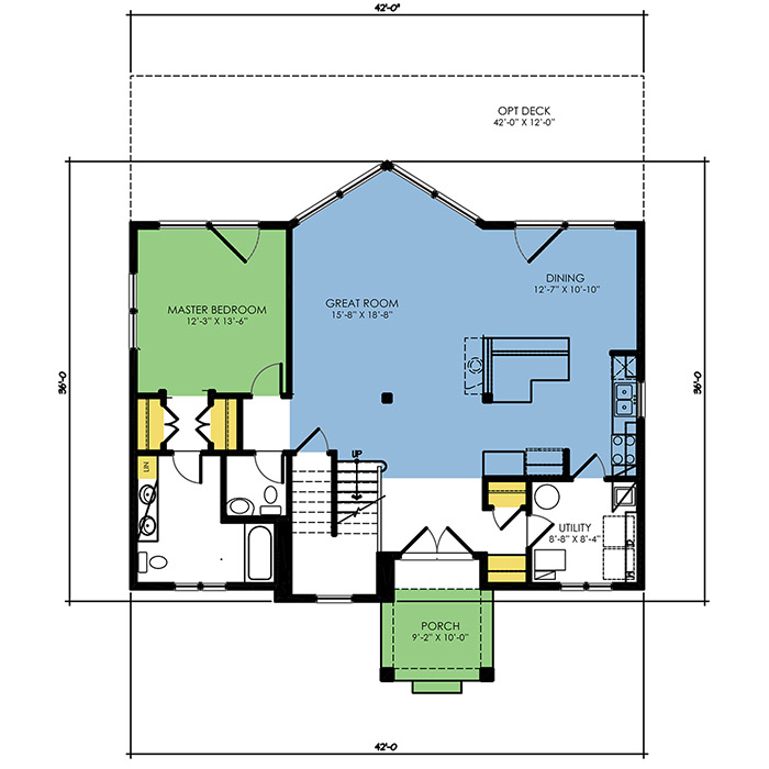 A part of our dream series, the tamarack floor plan features 3 bedrooms and 1.5 bathrooms with a foot print of 44x30 feet and 1342 total square feet of living space.